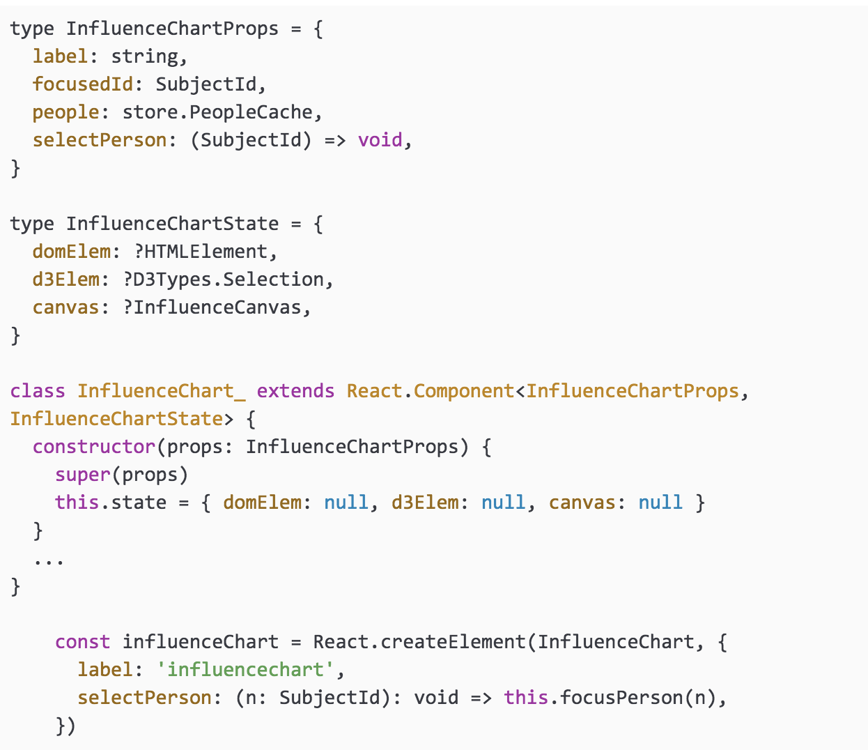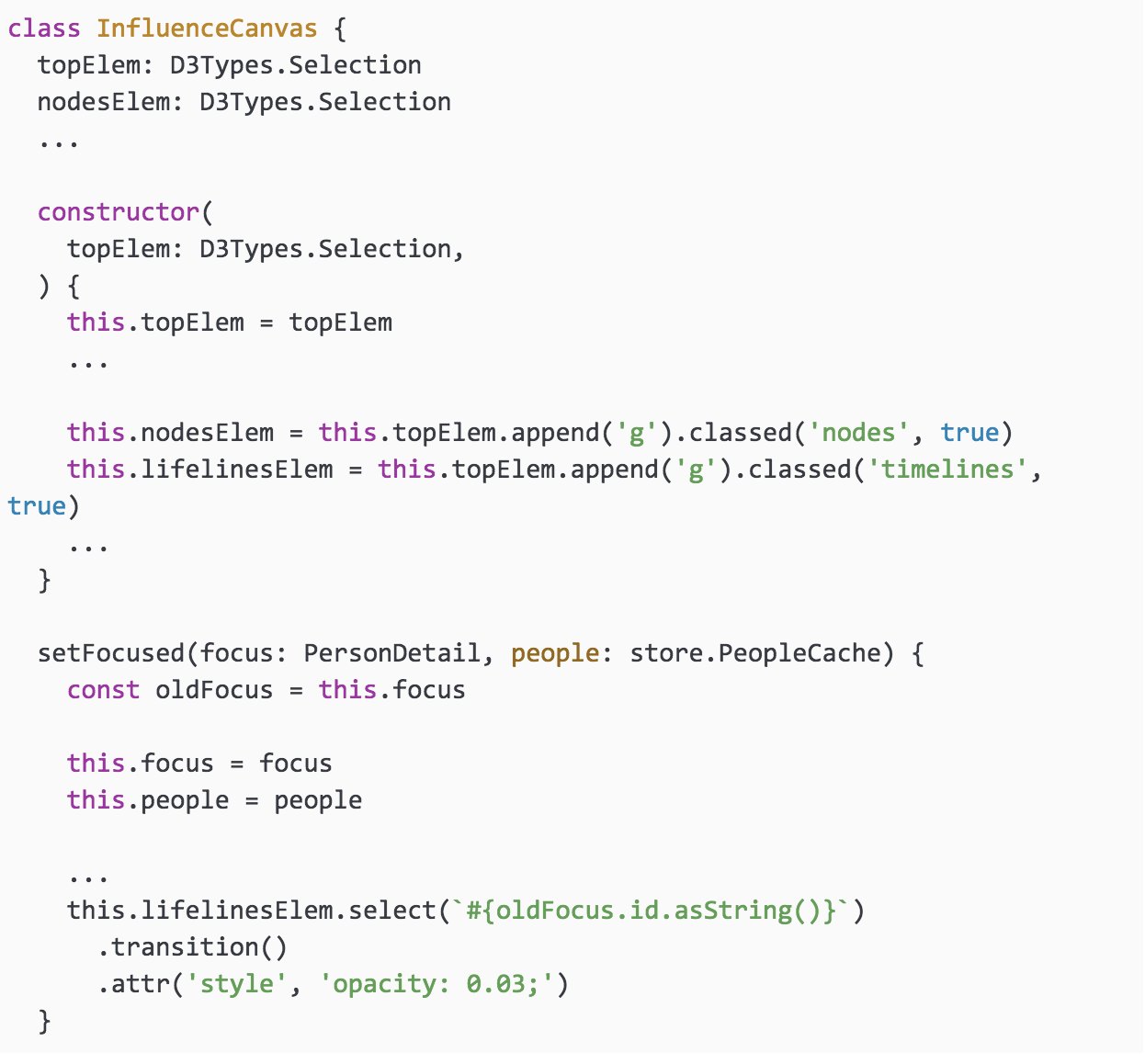 This is the core of the behavioral mismatch. We wanted to bridge the mismatch between React and D3’s relationship to the DOM. We created two objects, the InfluenceCanvas and the InfluenceChart. InfluenceCanvas provides the semantic concept of a display for a group of people who have influenced one another, and does so in the form of a traditional object in which methods mutate internal state over the lifetime of the object. InfluenceChart is a React component which plugs into React’s normal lifecycle methods to capture and respond to events from the browser and a data store.